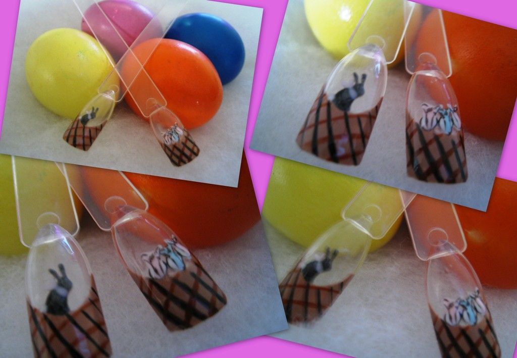 J'ai réalisé un panier en osier avec une french en gel beige et des traits de peinture acrylique de couleurs noir et sienne. Le lapin est composé de point de dotting tool en gel noir metallique et de gel blanc. J'ai également utilisé ce blanc pour les oeufs en ajoutant des traits de gel bleu et de rose pastel. Afin de donner du relief aux oeufs, j'ai tracé les contours en peinture acrylique noir.